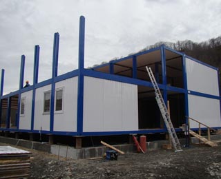 Модульное здание производится из типовых блок-модулей заводского изготовления блок-контейнеров, которые являются законченными объёмными конструктивными элементами полной готовности. Объёмно модульное здание контейнерного типа позволяет произвести монтаж здания за несколько дней, благодаря максимальной заводской готовности блок-контейнеров.
